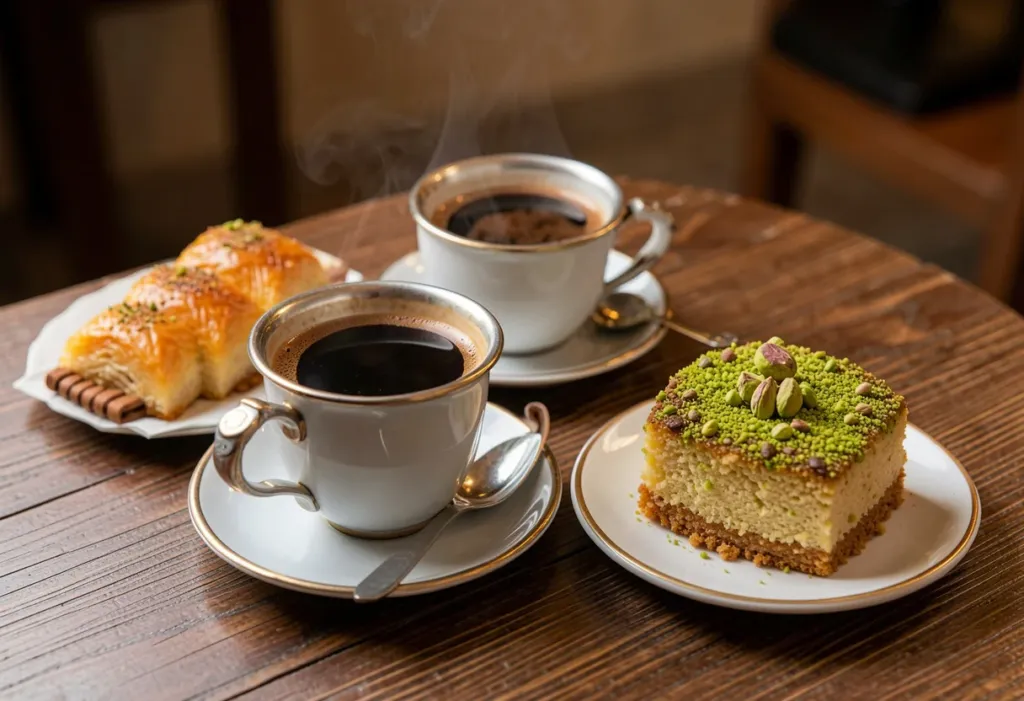 Turkish coffee brings intensity, depth, and aroma to dessert pairings. It creates a strong contrast with sweet flavors and highlights the richness of traditional pastries. The slightly bitter profile balances syrup-based desserts and keeps each bite from feeling too heavy. Its roasted aroma adds another layer of sensory experience to the table. Guests often enjoy coffee in small, slow sips between bites of dessert. This rhythm supports a relaxed and intentional dining pace. The pairing reflects a long-standing tradition in Turkish dessert culture and adds structure to the overall meal experience.