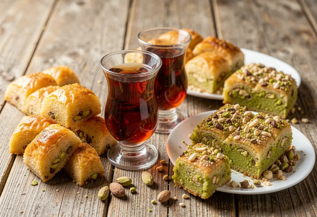 Tea plays an important role as a natural flavor reset during dessert service. A warm sip of tea clears lingering sweetness after each bite of a rich pastry. This simple step helps the palate stay fresh and ready for the next taste. Guests often move between dessert and tea in a steady rhythm. This pattern supports a relaxed pace at the table. Turkish dining traditions encourage slow enjoyment rather than quick eating. Tea helps maintain balance throughout the dessert experience. It also supports conversation and comfort during the final stage of the meal.