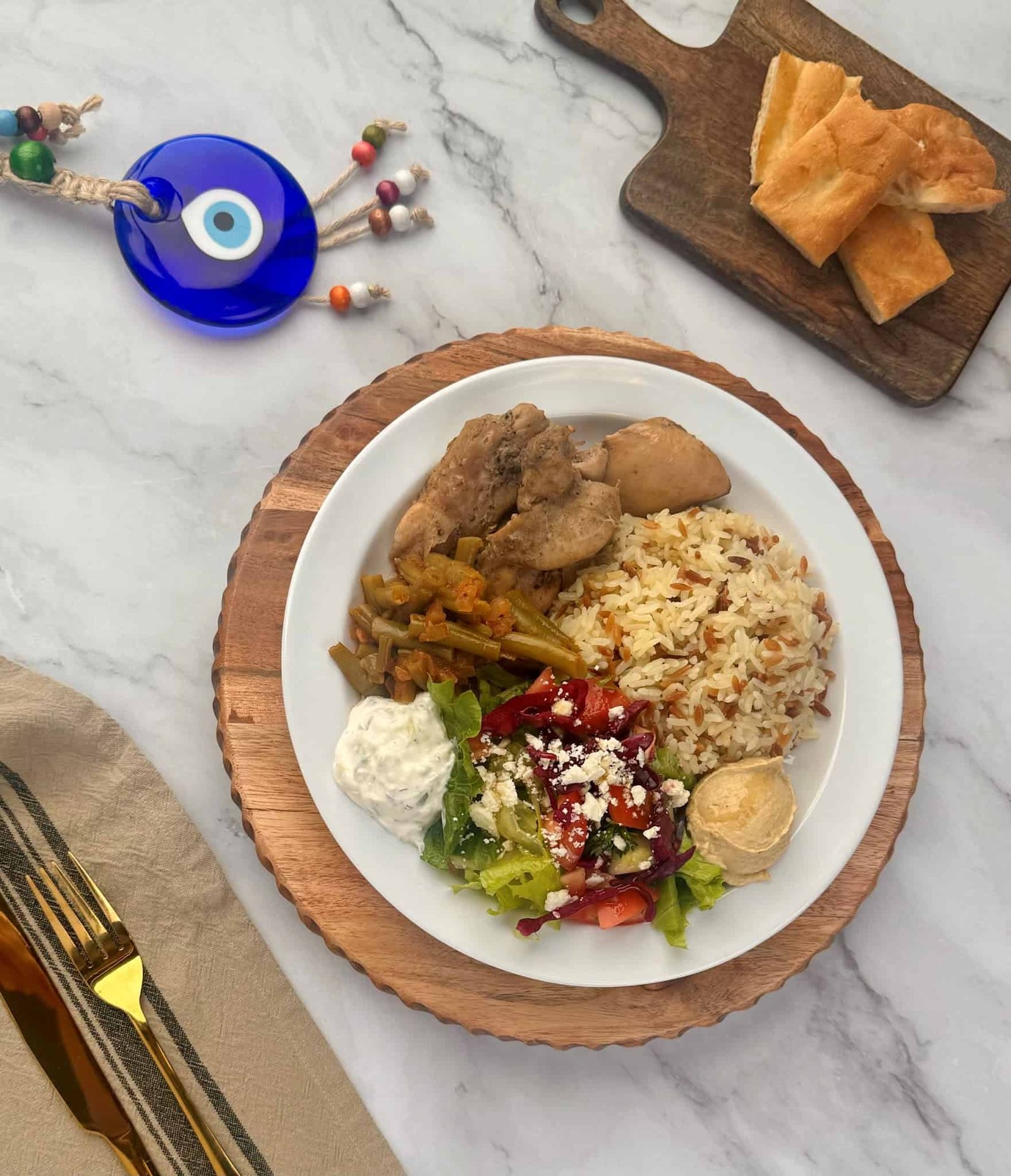 Served with green beans, rice pilav with orzo, tzatziki, hummus, green salad with feta cheese, romaine lettuce, red cabbage, and Turkish salad.