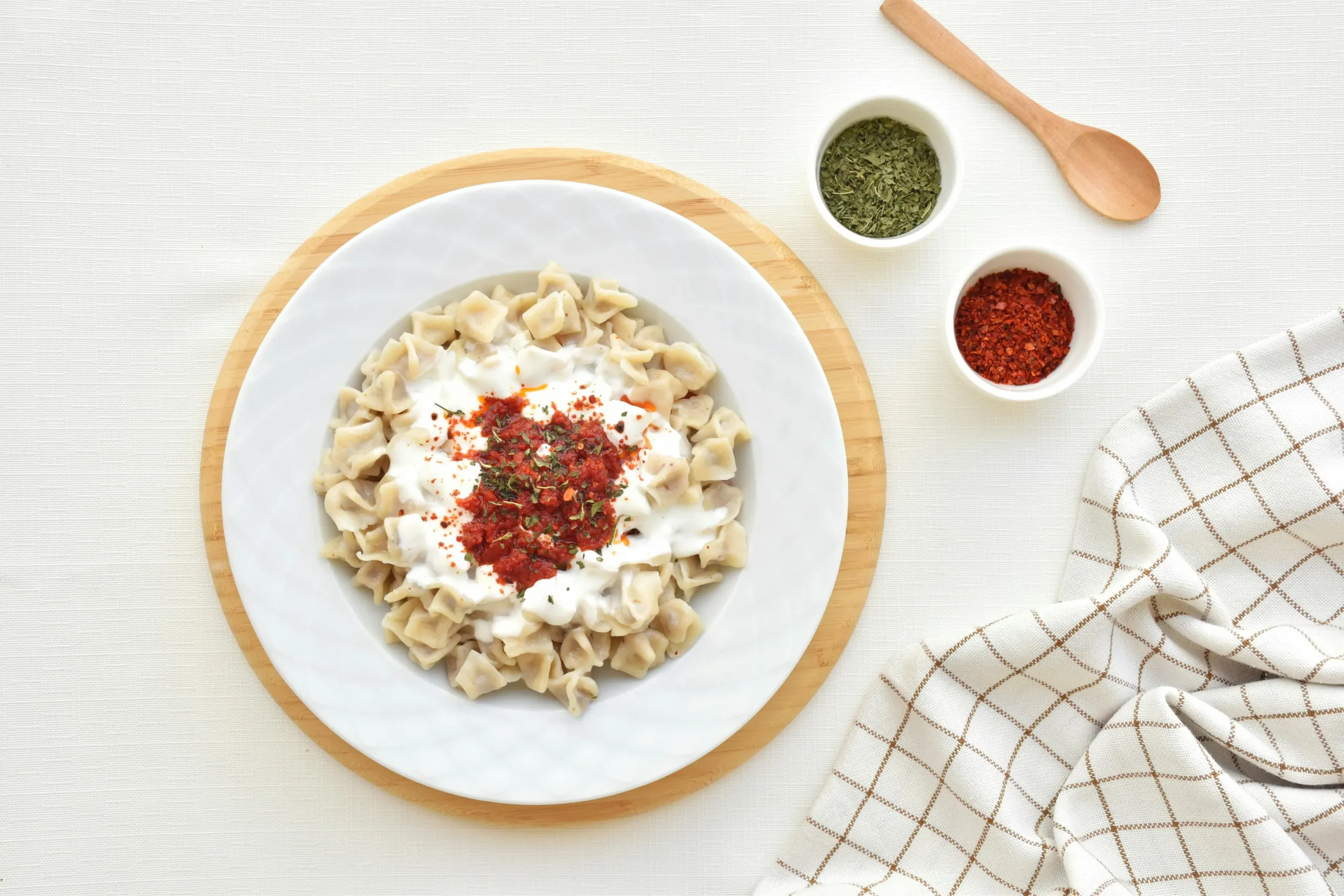 The finishing touch on Turkish manti is a drizzle of melted butter infused with spices, most commonly red pepper flakes or paprika. The butter is gently heated until fragrant, allowing the spices to bloom and release their color and aroma. Once poured over the garlicky yogurt, it creates a warm, silky layer that contrasts beautifully with the cool creaminess beneath.